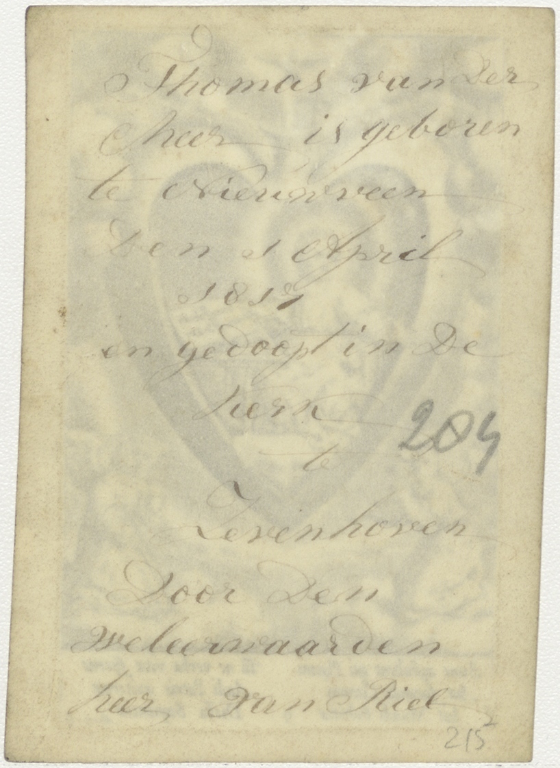 Christuskind als leraar in een hart, kz. Thomas van der Meer, geboren te Nieuwveen 1817, gedoopt te Zevenhoven door Van Riel