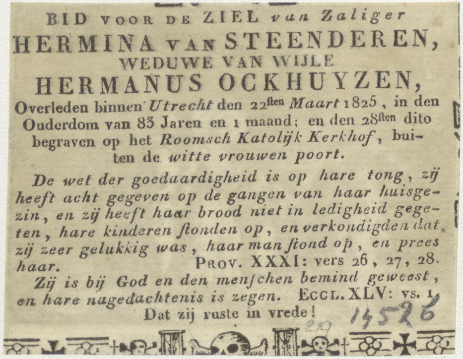 Lazarus opgewekt uit de dood, kz. Bid voor ziel Hermina van Steenderen (+1825);Utrecht