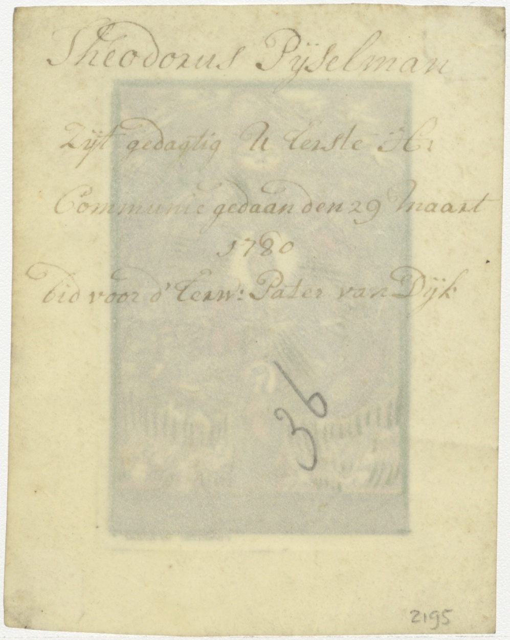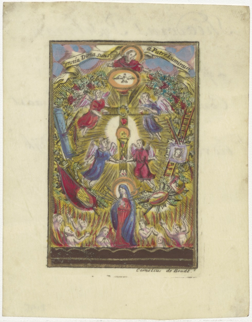 Moeder van Smarten, Maria Middelares, lijdenswerktuigen vagevuur, ingekleurd, kz. H. Communie Theodorus Pijselman;1780