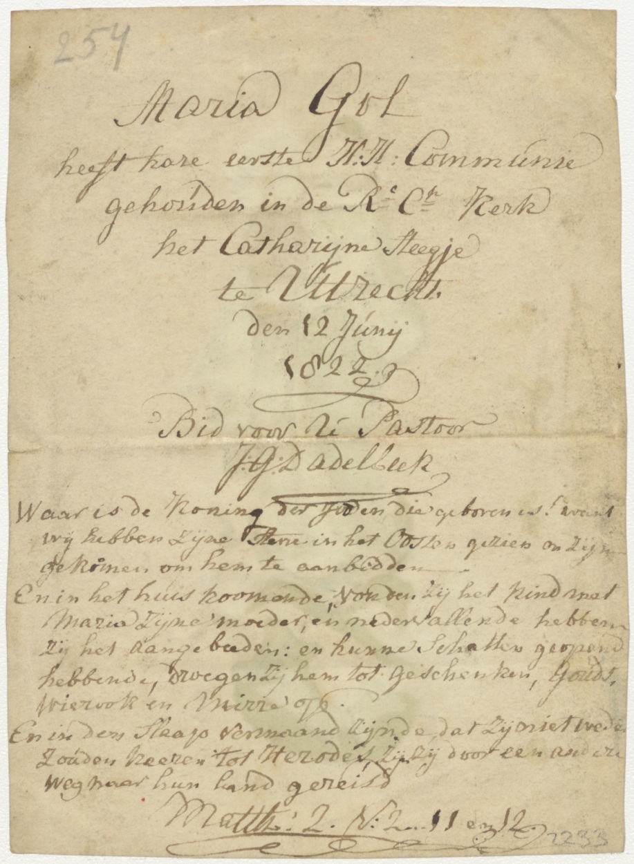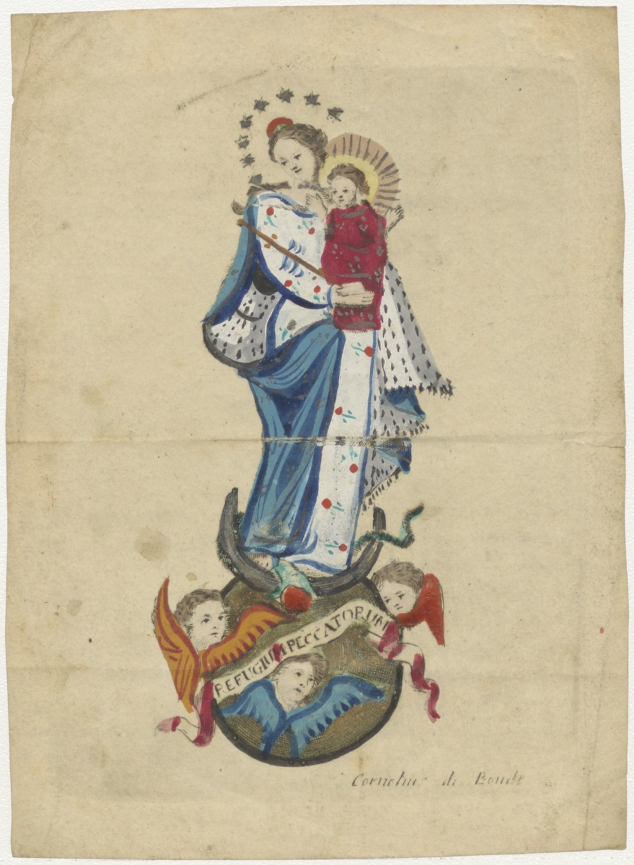 Maria met Christuskind, toevlucht der zondaren, ingekleurd, kz. H. Communie Maria Gol;1822;Utrecht