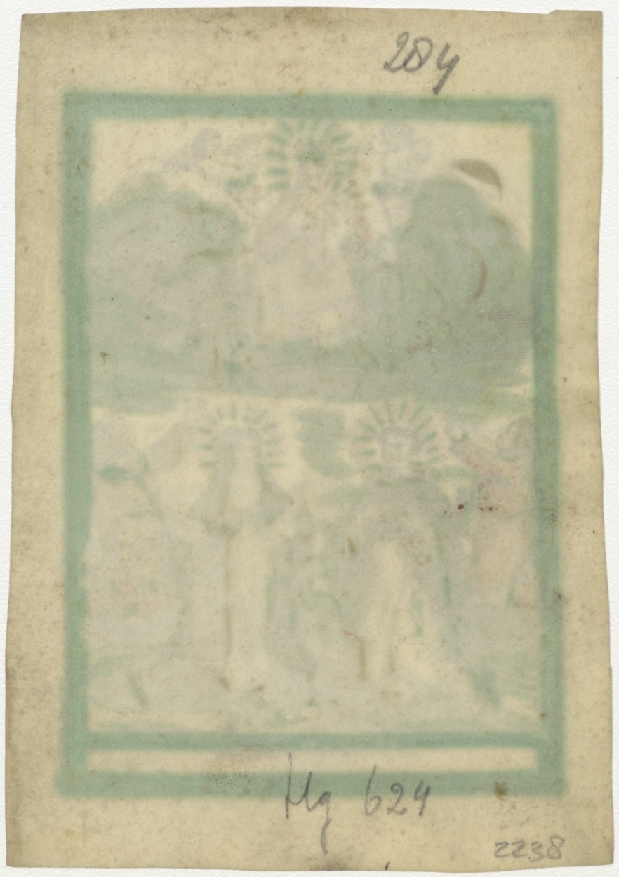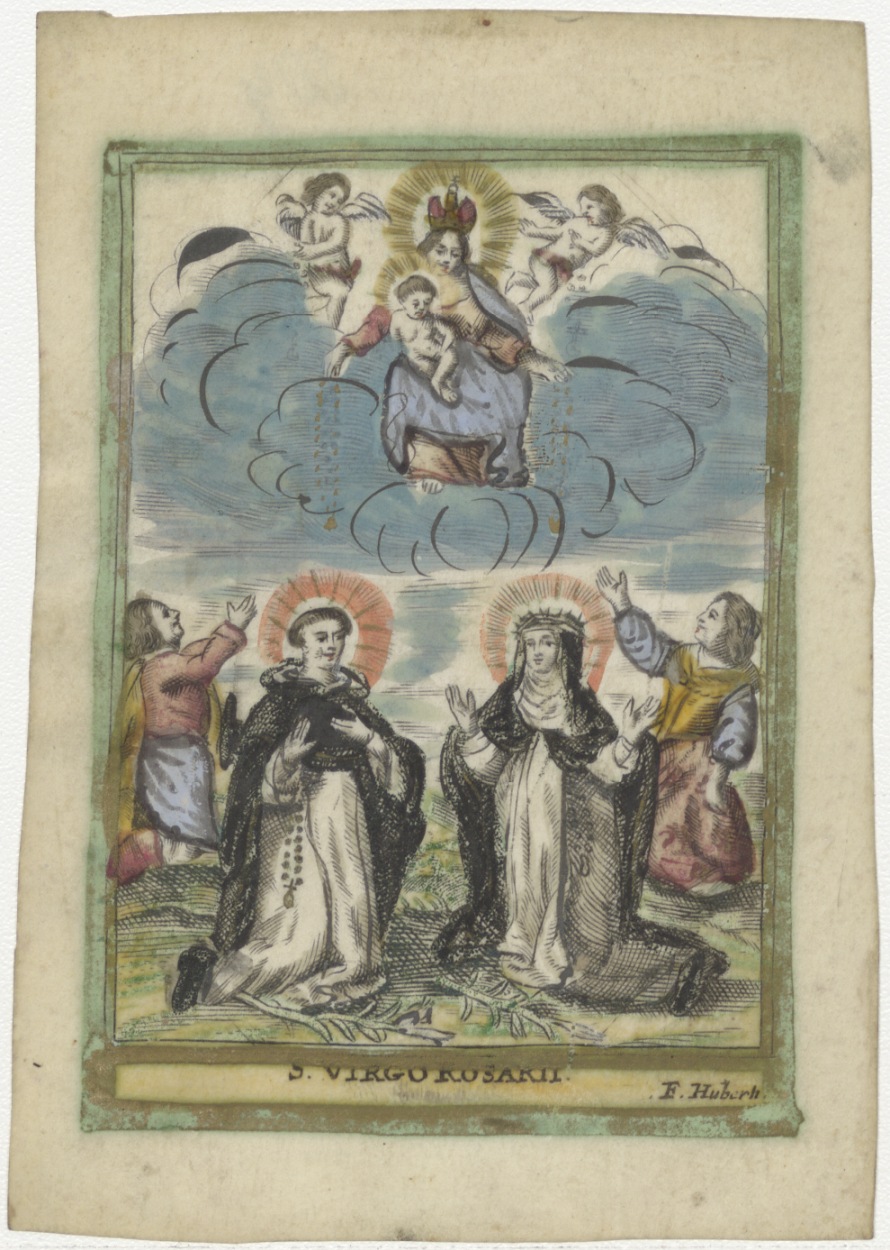 Maria met Christuskind geeft de H. Rozenkrans aan H. Dominicus en H. Catharina van Siena, ingekleurd