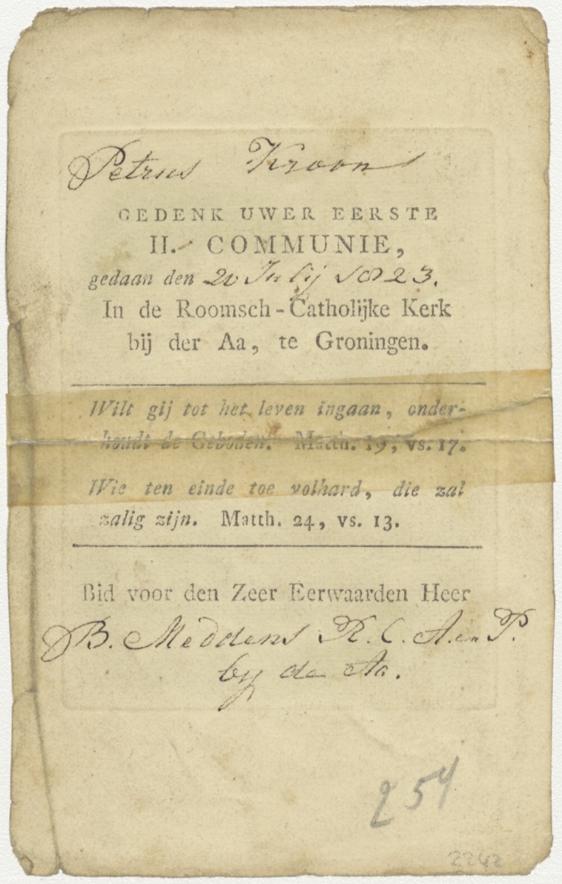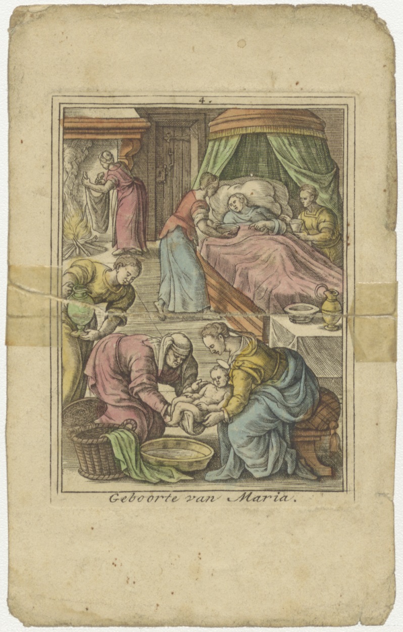 Geboorte van Maria, nr. 4 uit een serie, ingekleurd, kz. H. Communie Kroon;1823;Groningen