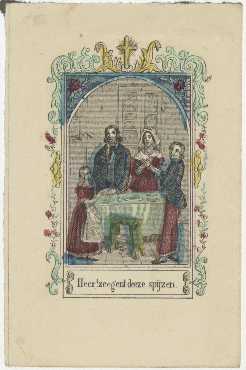 Gebed voor de maaltijd met 'Heer! zeegent deze spijzen', ingekleurd