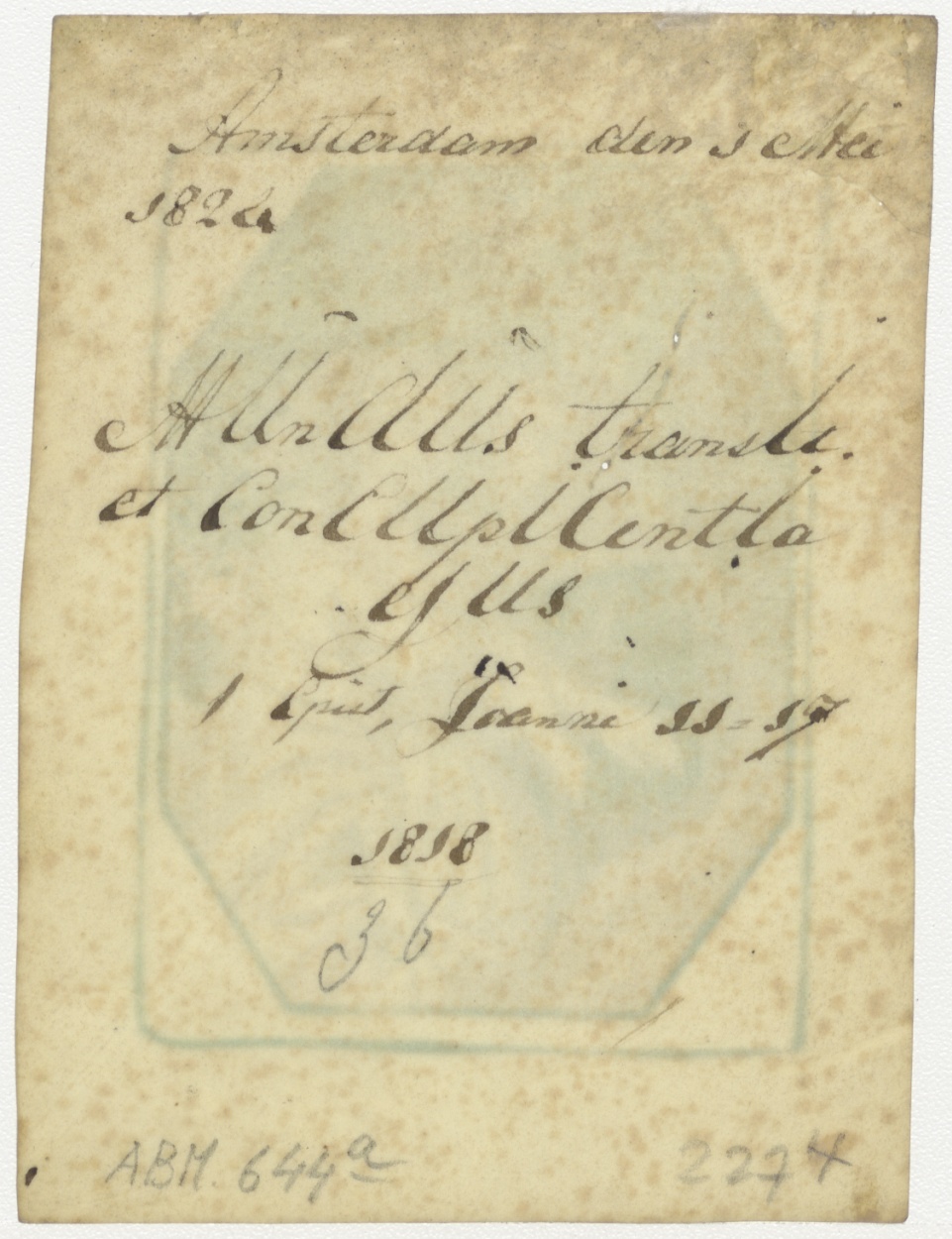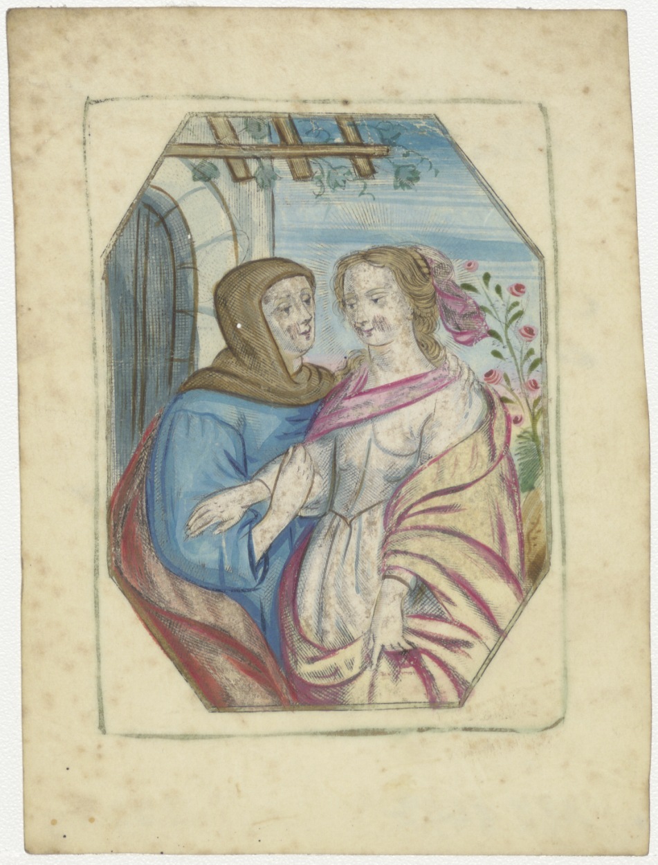 Visitatie, ontmoeting Maria en Elisabeth, ingekleurd, kz. Amsterdam den 3 Mei 1824;..1 Epist. Joanni..1818