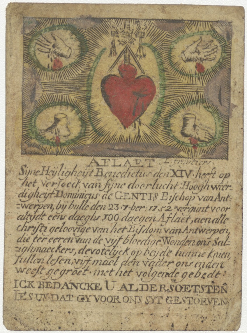 H. Hart met de gewonde rechter- en linkerhand en de lijdenswerktuigen en doorboorde voeten, ingekleurd