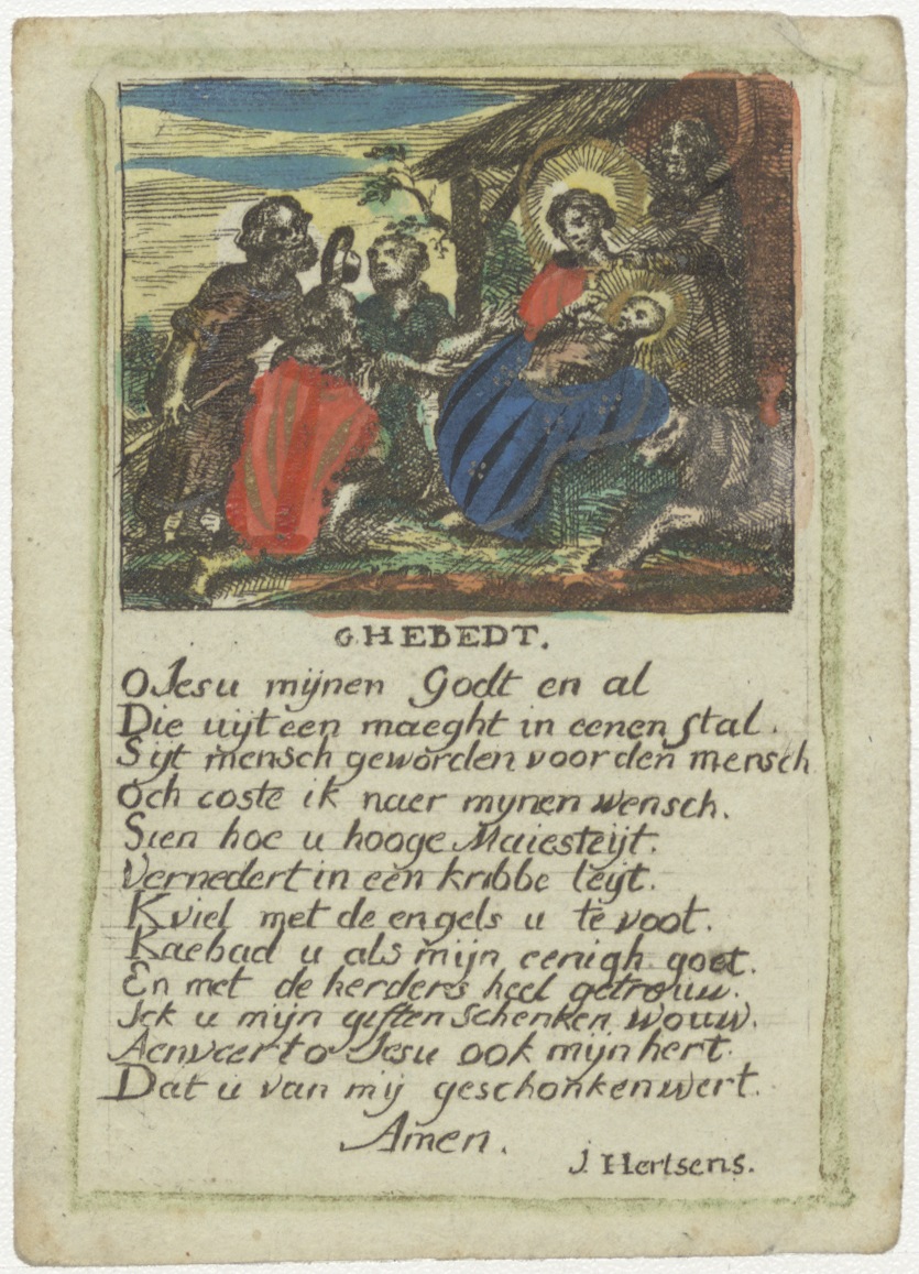 De aanbidding der herders, ingekleurd, met "Ghebedt, O Jesu mijnen Godt en al Die uijt een maeght in eenen stal ..."