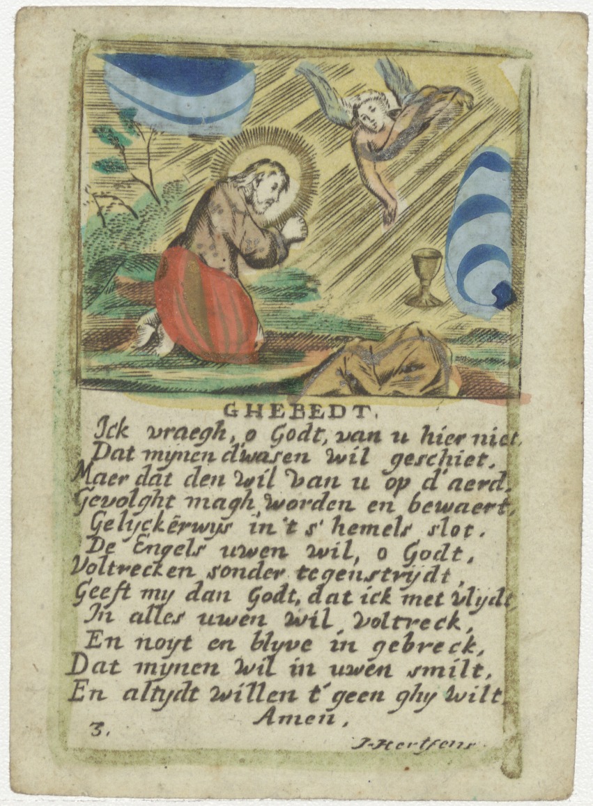 Christus in de Hof van Olijven, ingekleurd, met "Ghebedt, Ick vraegh, O Godt van u hier niet. Dat mijnen dwasen wil geschiet. ..."