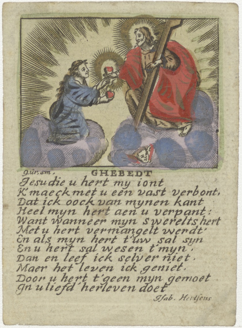 Christus geeft zijn hart aan de mensen, ingekleurd, met "Ghebedt, Jesu die u hert mij iont. k' maeck met u een vast verbont. ...", kz. Bid voor ziel Lenuaers (+1803);Oegstgeest