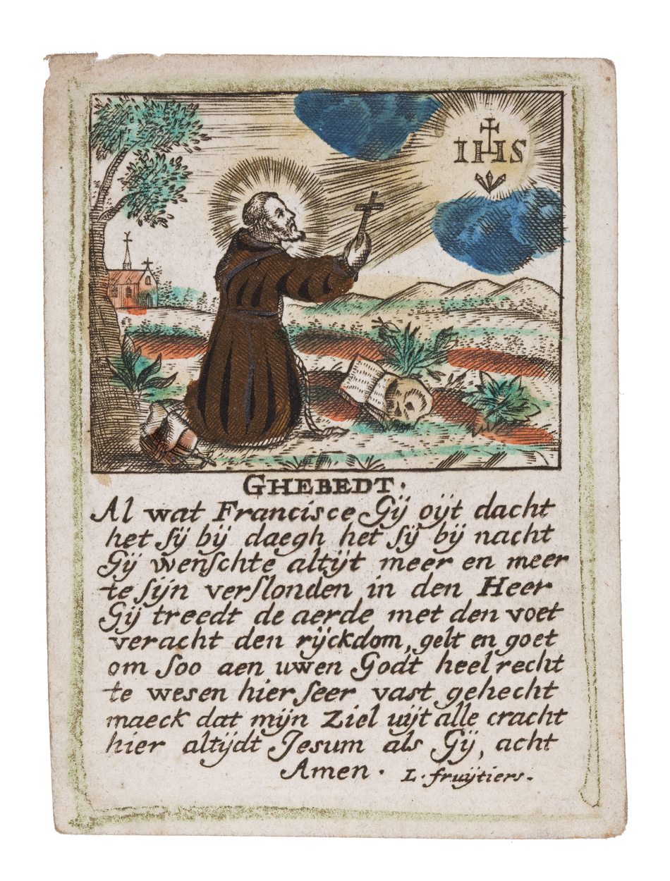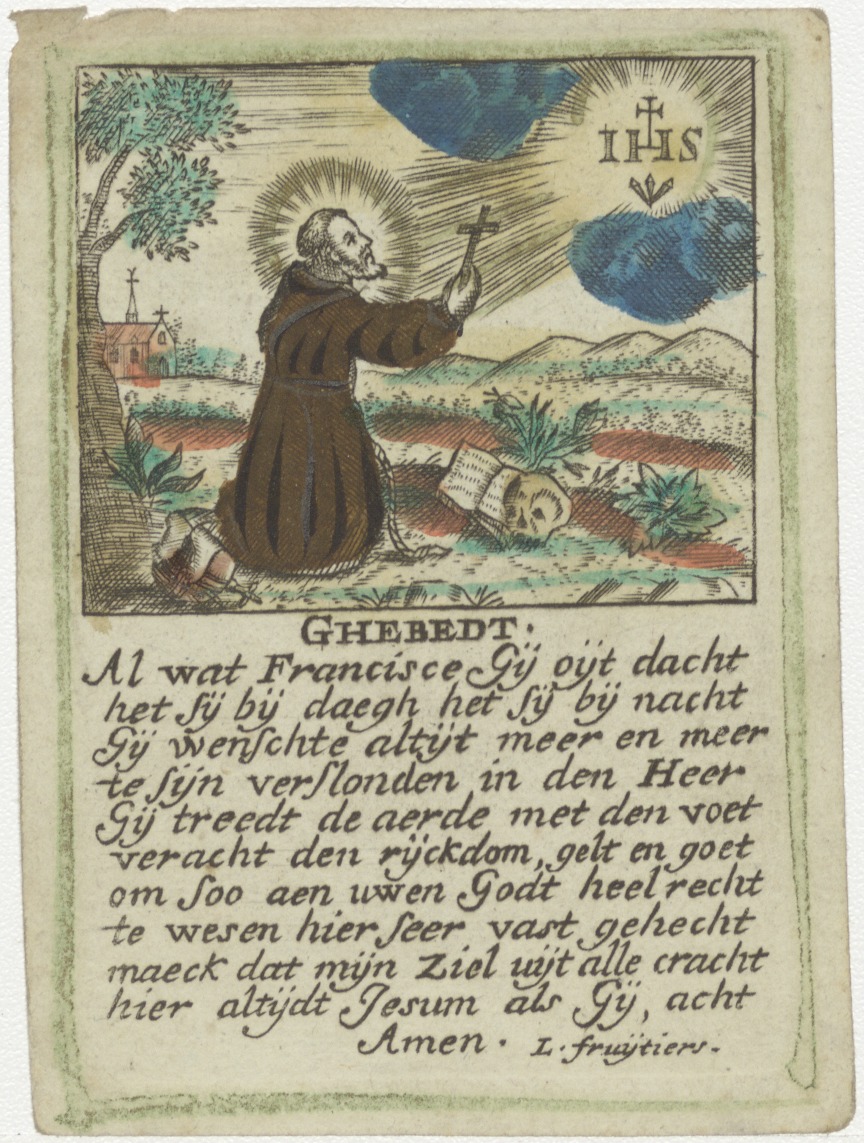 H. Franciscus van Assisië, ingekleurd, met gebed: GHEBEDT / Al wat Francisce Ghij oijt dacht / het sij bij daegh het’sij bij nacht / Gij wenschte altijt meer en meer / te sijn verslonden in den Heer / Gij treedt den aerde met den voet / veracht den rijckdom, gelt en goet / om soo ...