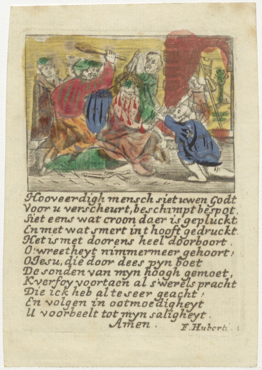 De bespotting van Christus, ingekleurd, kz. tekst (Frans)