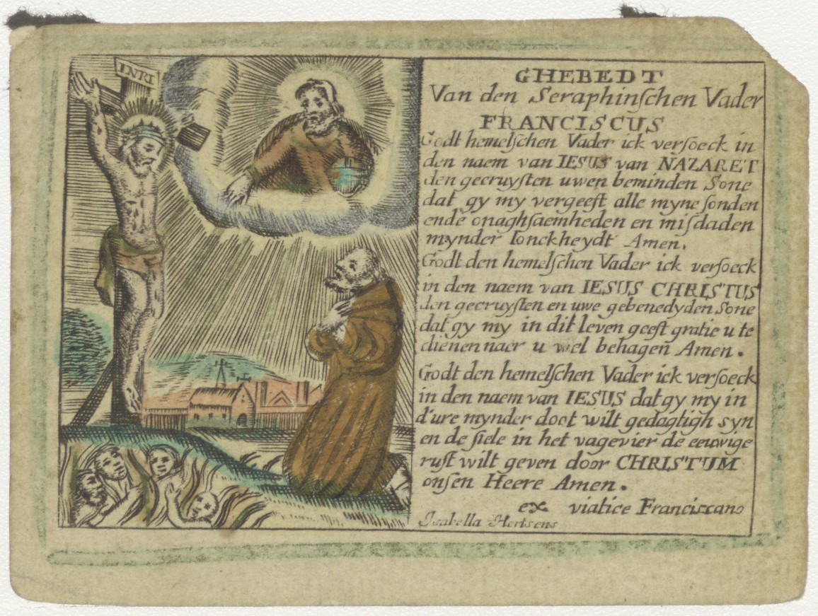 H. Franciscus neergeknield voor 't kruis, ingekleurd, met "Ghebedt, Van den Seraphinschen Vader Franciscus Godt hemelschen Vader ick versoeck in den naem van Iesus van Nazaret ..."