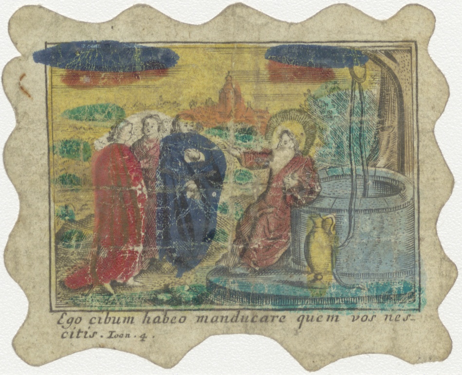 Christus en discipelen bij de waterput te Sichar, na de terugkeer van Samaritaanse vrouw, ingekleurd