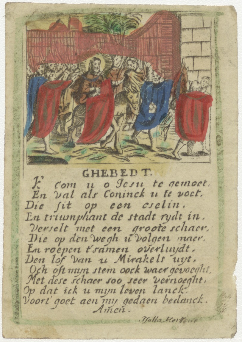 Intocht in Jeruzalem, ingekleurd, met "Ghebedt, K' com u o Jesu te gemoet. En val als Coninck u te voet. ..."