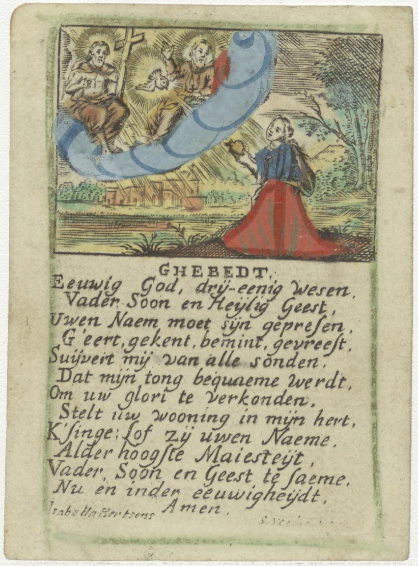 H. Drievuldigheid, ingekleurd, met "Ghebedt, Eeuwig God, drij-eenig wesen, Vader Soon en Heijlig Geest, ..."
