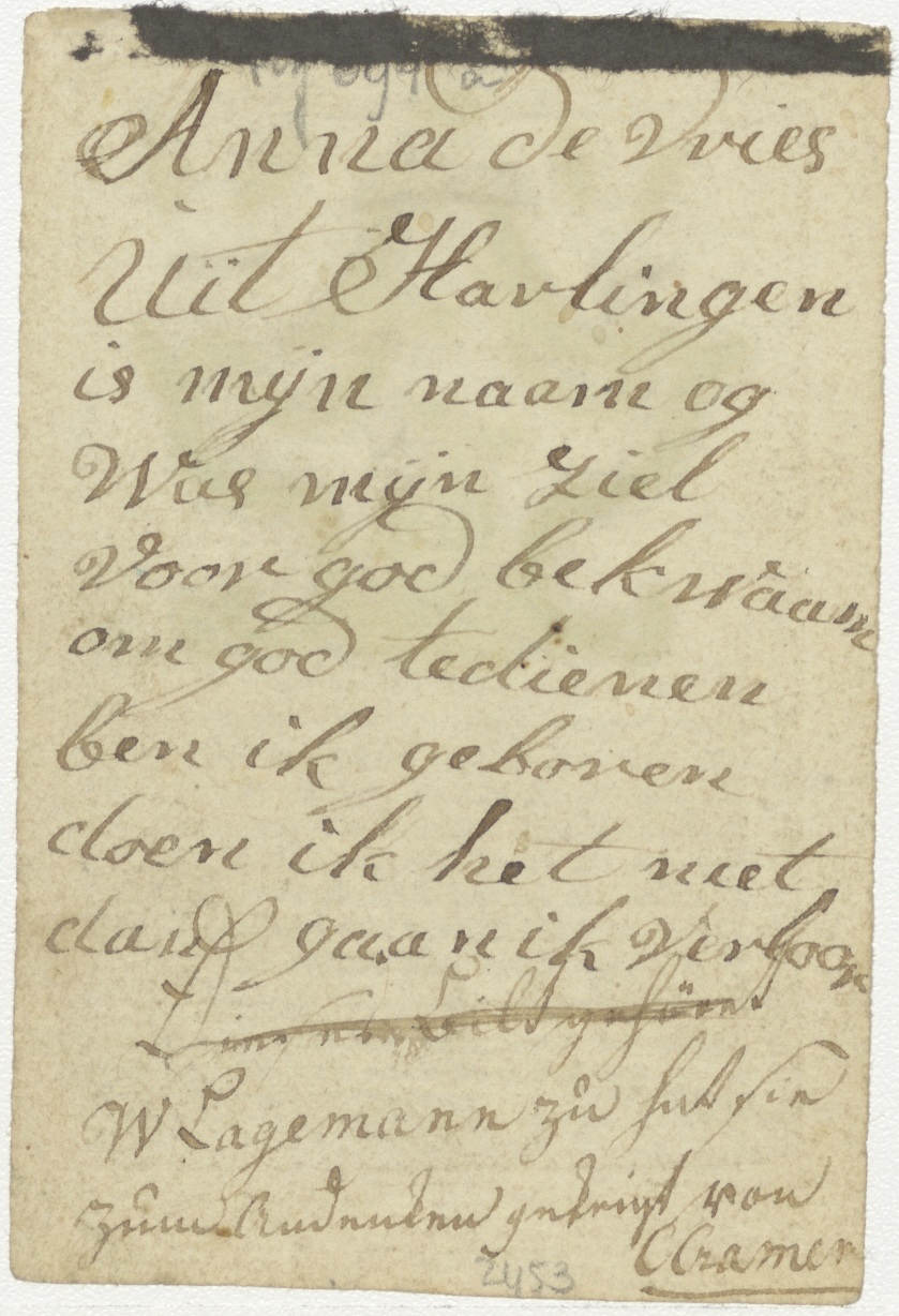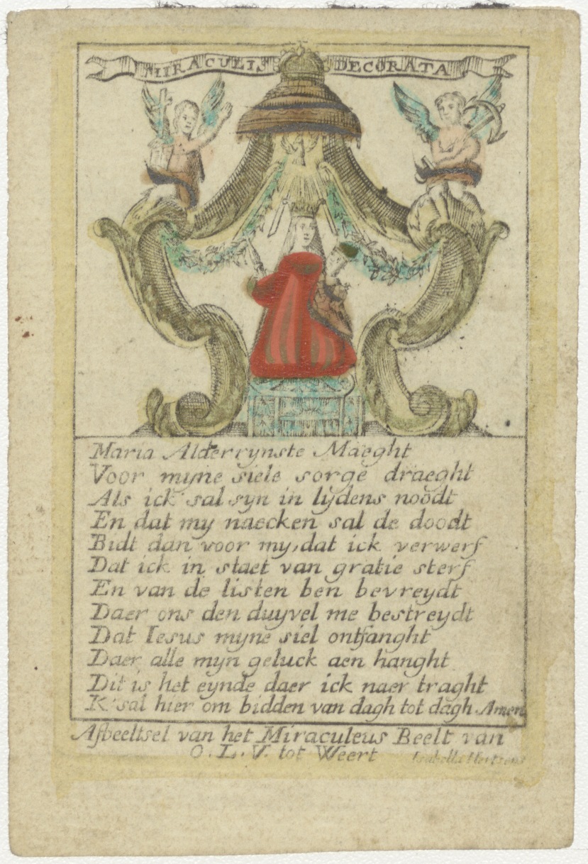 O.L.V. Beeld te Weert, ingekleurd, met "Maria Alderrijnste Maeght ...", kz. Anna de Vries uit Harlingen is mijn naam, was mijn ziel voor God bekwaam om God te dienen, etc.