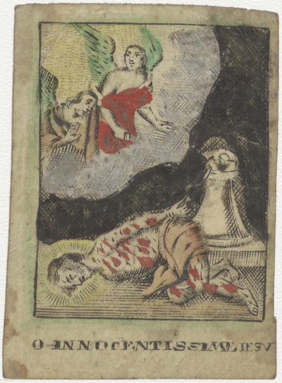 Christus ligt met wonden overdekt naast de geselkolom, boven Hem zwevende engelen, ingekleurd