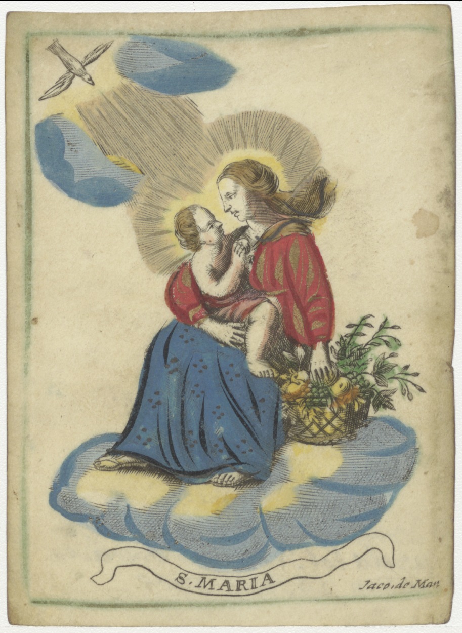 Maria met kind, zittend, met fruitmand op een wolk, ingekleurd, kz. Bid voor ziel Anetje Bezelis (+1705);Nieuwveen