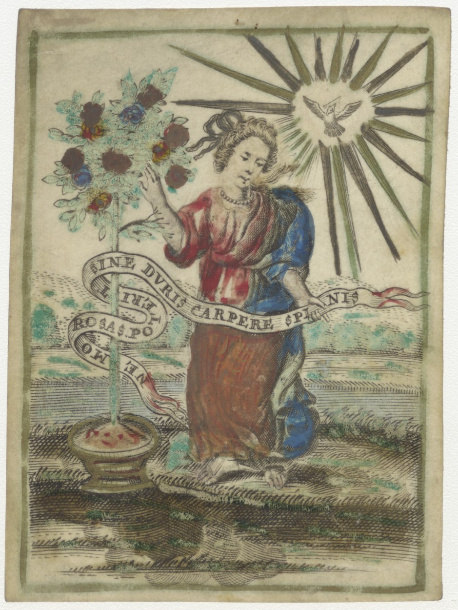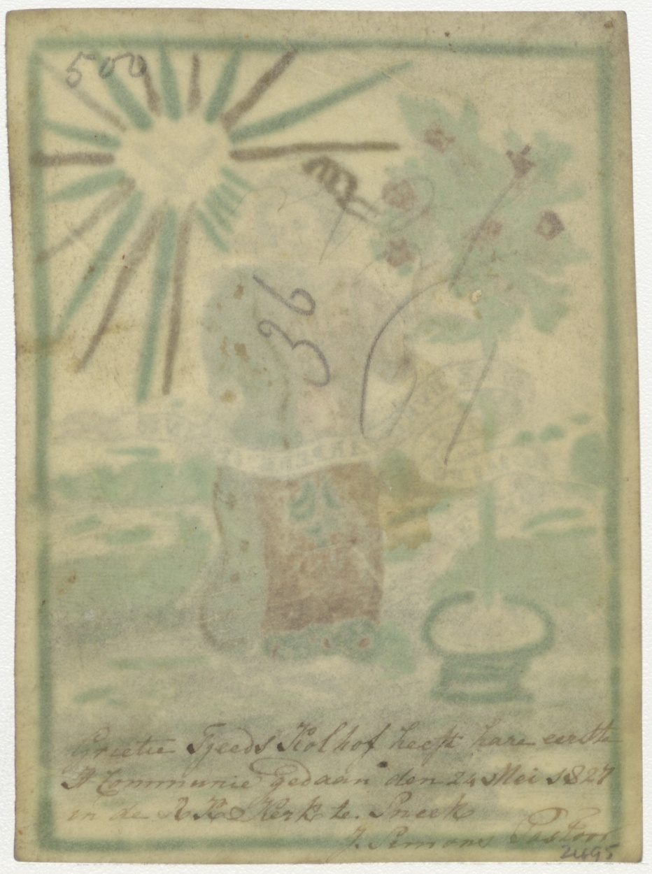 Meisje bij rozenstruik en de H. Geest, ingekleurd, kz. H. Communie Kalhof;1827;Sneek;J. Simons pastoor