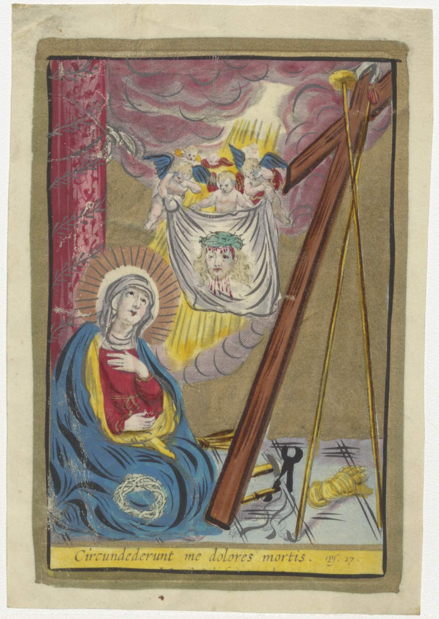 Maria, moeder van smarten, met de lijdenswerktuigen, ingekleurd