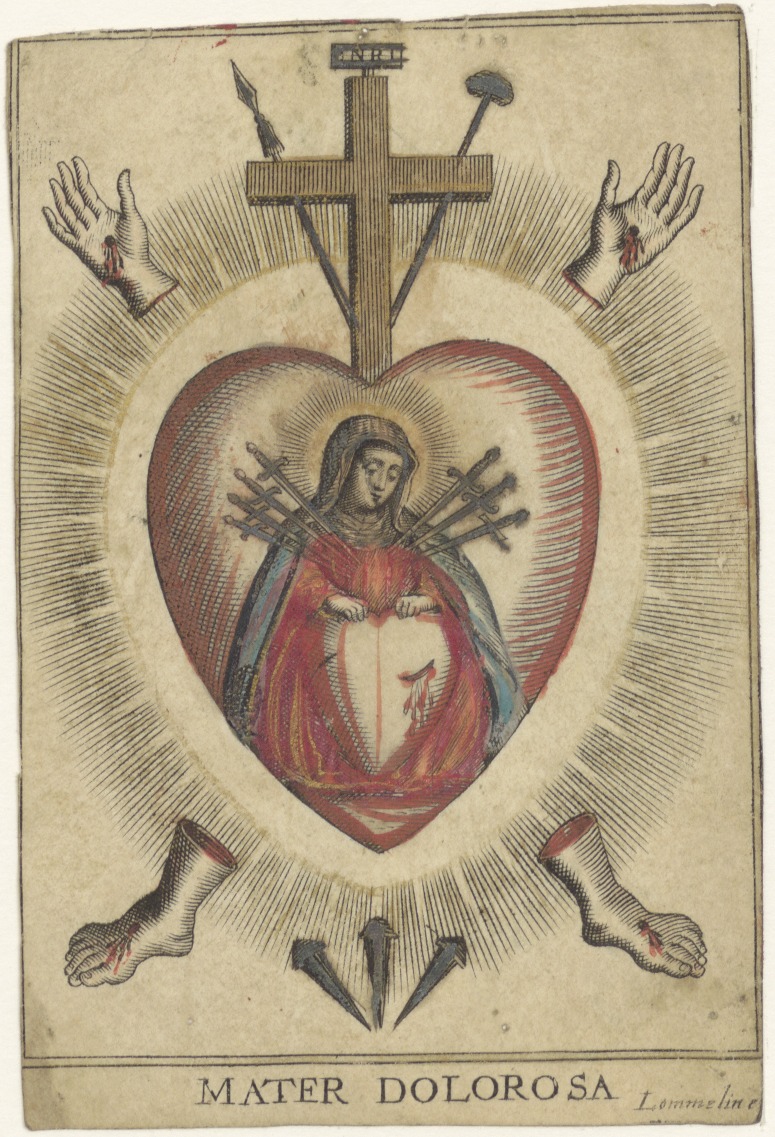 Maria, Mater Dolorosa met de lijdensattributen, ingekleurd