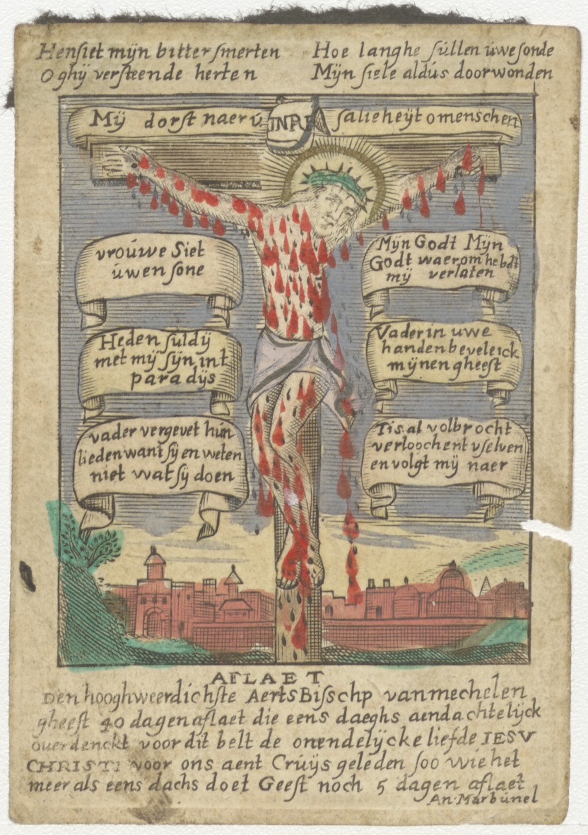 De zeven kruiswoorden, Christus aan het kruis, ingekleurd, kz. Aflaat van de aartsbisschop van Mechelen