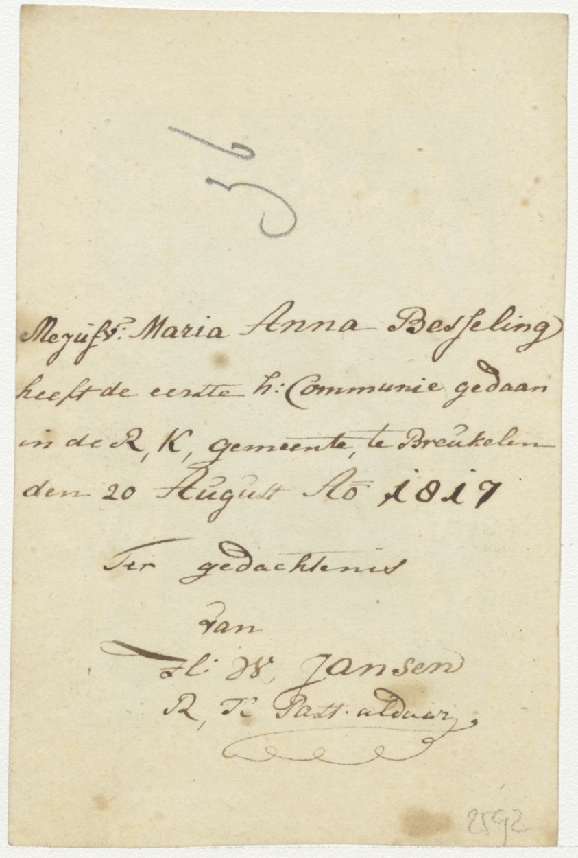 Dienstmaagd des heren, ingekleurd, kz. H. Communie Beseling, Breukelen 1807