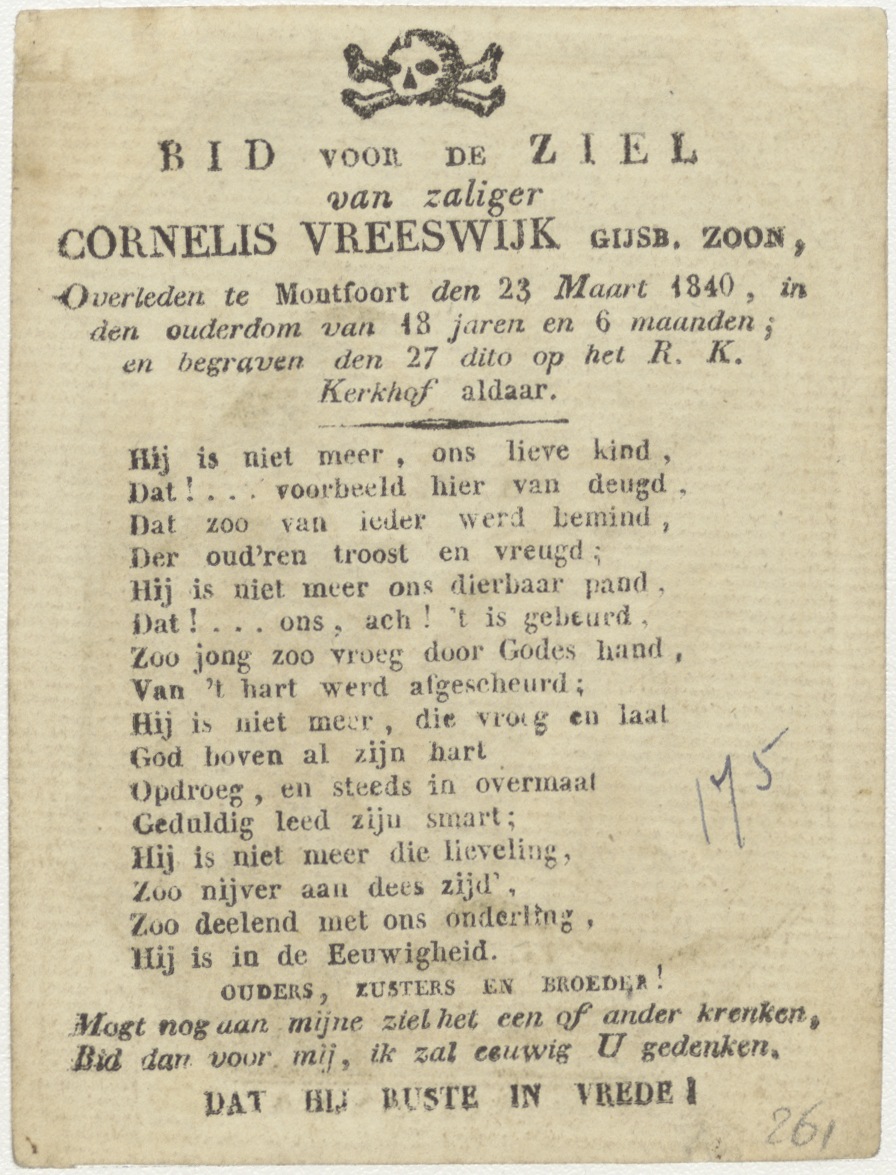 Anna te Drieën, kz. Bid voor ziel Cornelis Vreeswijk Gijsb. zoon (+1840);Montfoort