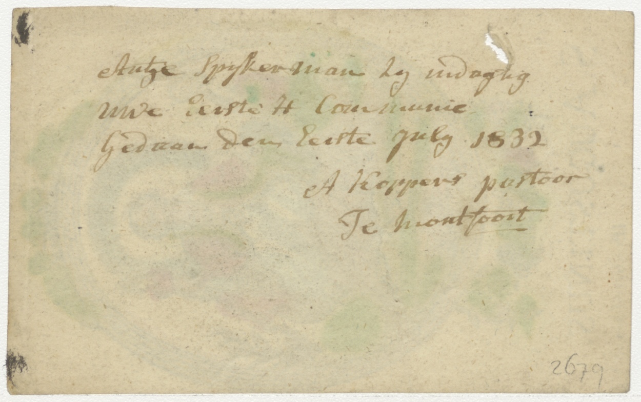 H. Augustinus, ingekleurd, kz. H. Communie Antje Spijkerman, Montfoort 1832, Koppers pastoor