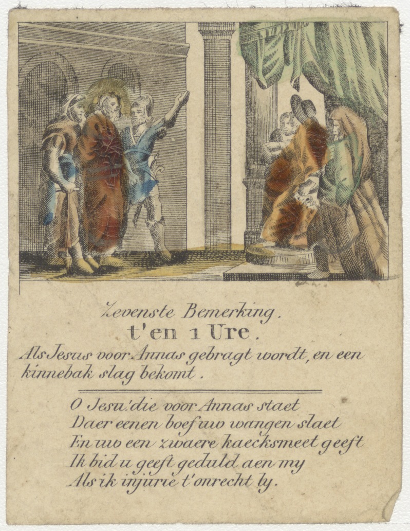 Christus voor Annas, ingekleurd, kz. Tekst