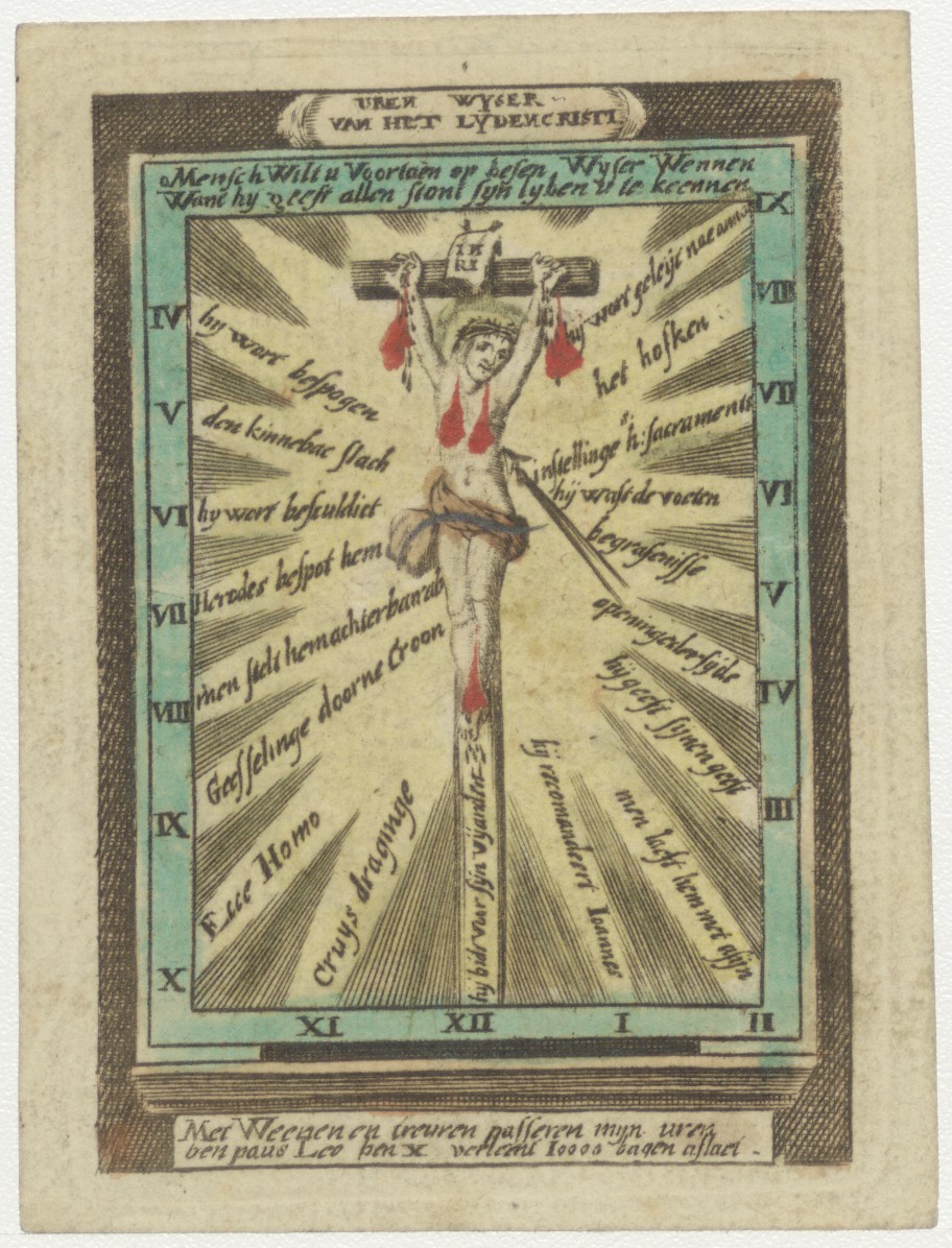 Christus aan het kruis, urenwijzer van het lijden van Christus, ingekleurd