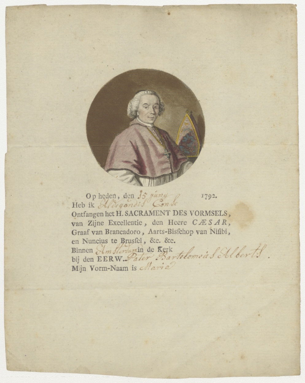 Vormselprent met portret van Mgr. Van Brancadoro, bisschop van Nisibi, kz. H. Vormsel Aldegondis Conse (1792) door bisschop De Brancadoro