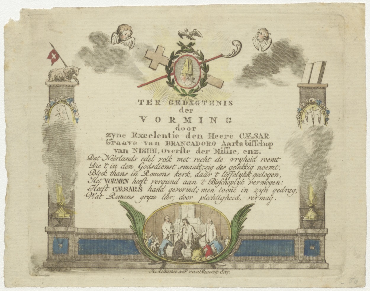Bisschop met mijter, staf en kruis en H. Geest, Lam Gods en H. Vormsel, kz. H. Vormsel door Bisschop De Brancadoro van Nisibi