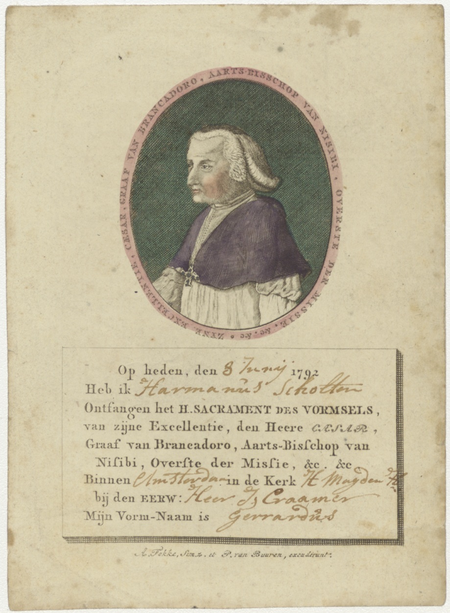 Portret bisschop De Brancadoro, tekst, ingekleurd, kz. H. Vormsel Scholten, door bisschop De Brancadoro, Amsterdam 1792