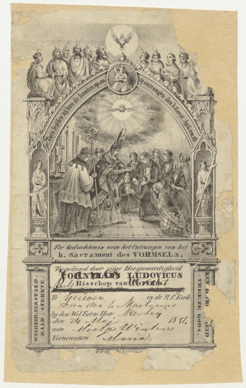 Toediening H. Vormsel, pinksteren, kz. H. Vormsel Mietje Winters (1845) door bisschop Wijkerslooth, Herwen