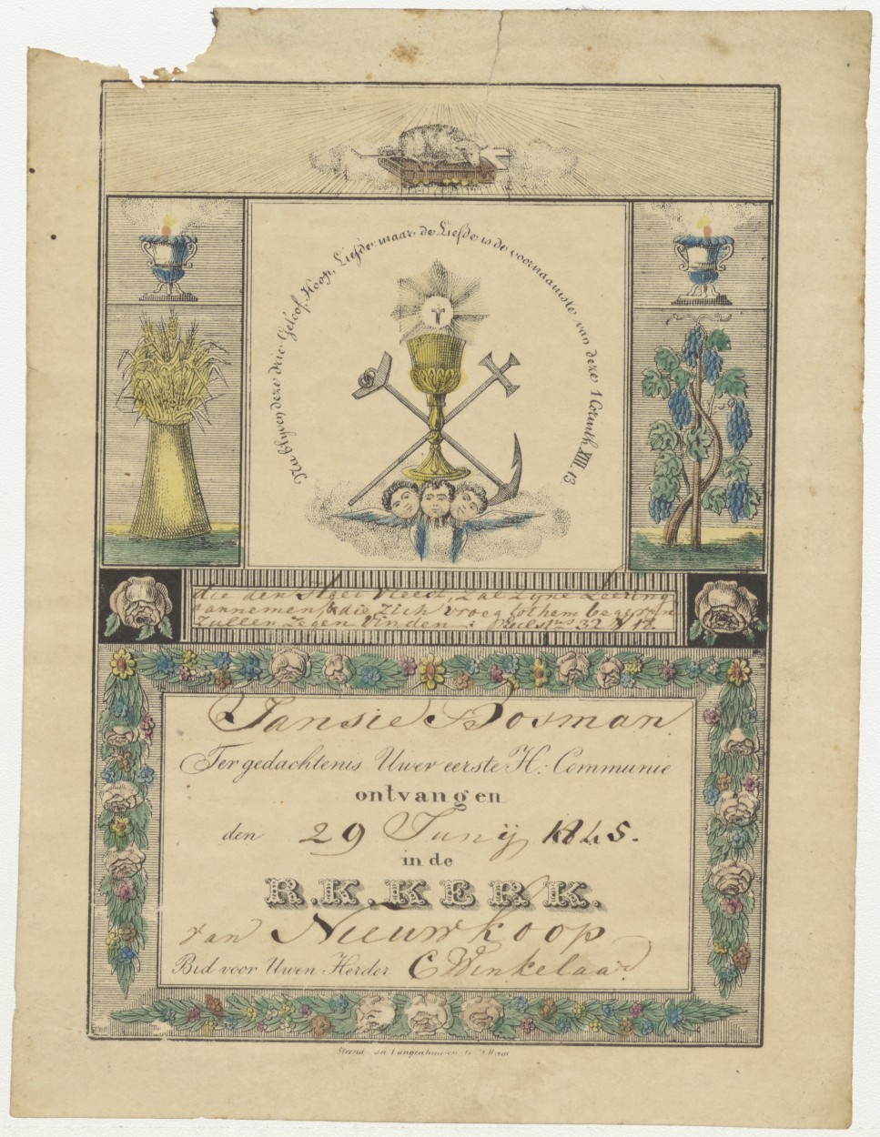 Kelk, Lam Gods, symbolen geloof, hoop en liefde, ingekleurd, kz. H. Communie Bosman, Nieuwkoop 1845