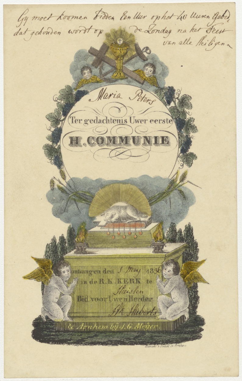 Lam Gods, ingekleurd, kz. H. Communie Peters, Huissen 1836