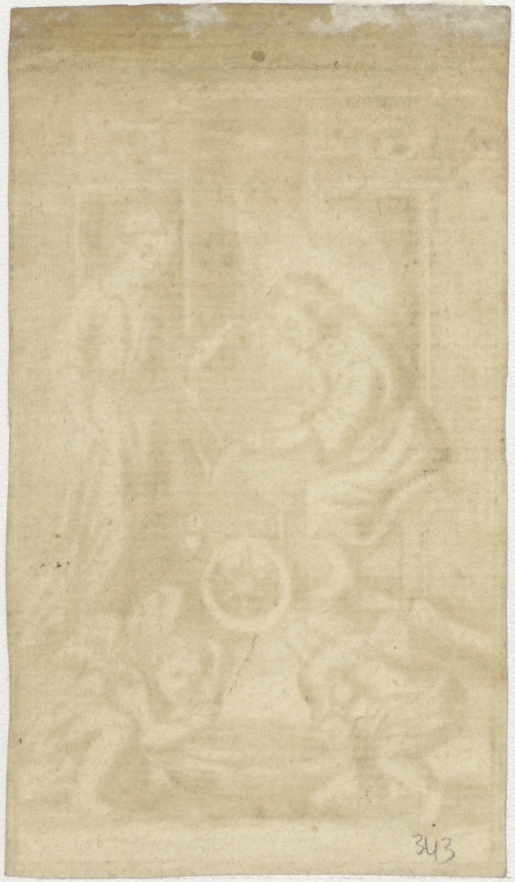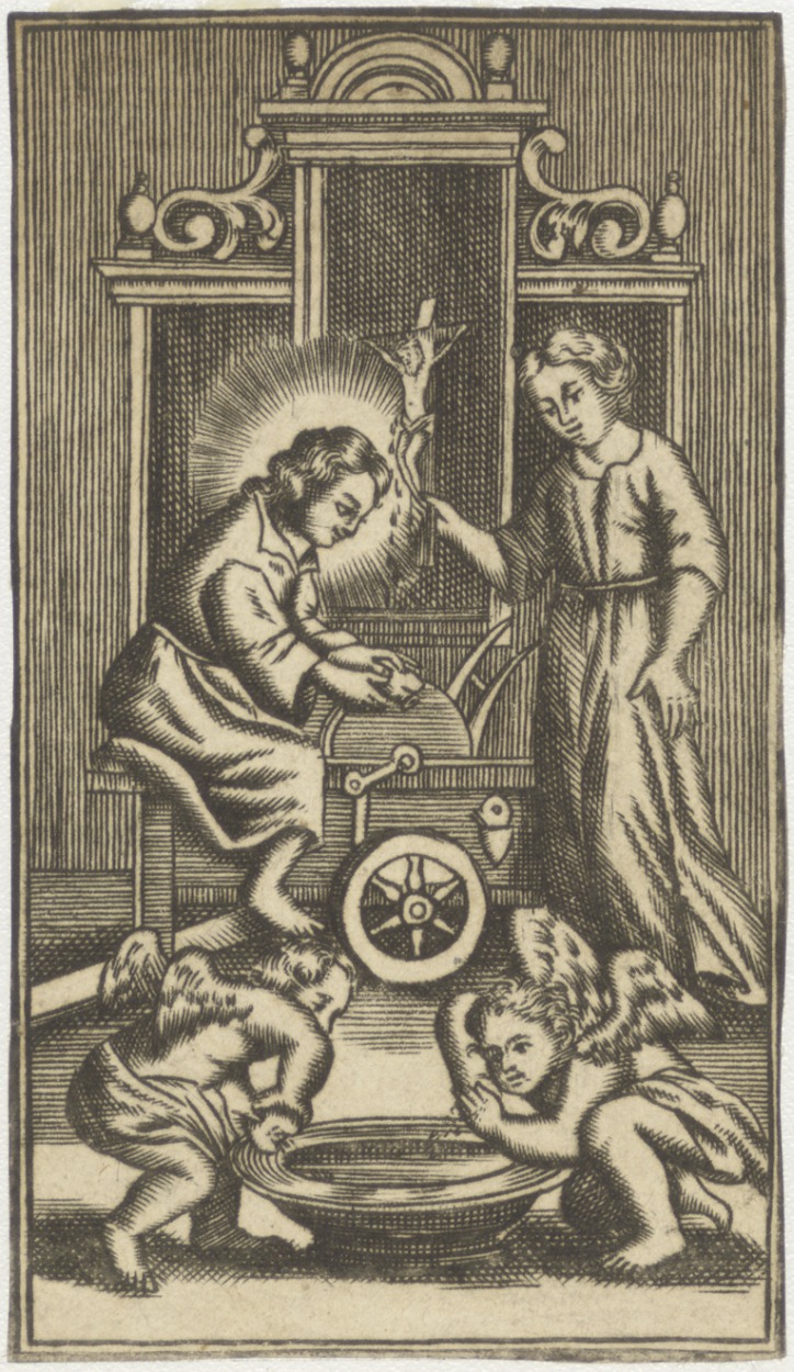 Christuskind zittend bij een slijpsteen, een vrouw houdt hem een kruisbeeld voor, twee engelen