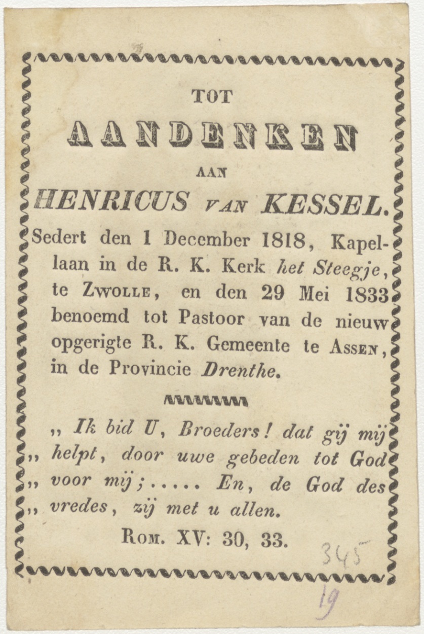 H. Marcellinus, kz. Religieus;Aandenken aan Henricus van Kessel, sinds 1 december 1818 kapelaan te Zwolle en den 29 mei 1833 benoemd tot pastoor te Assen