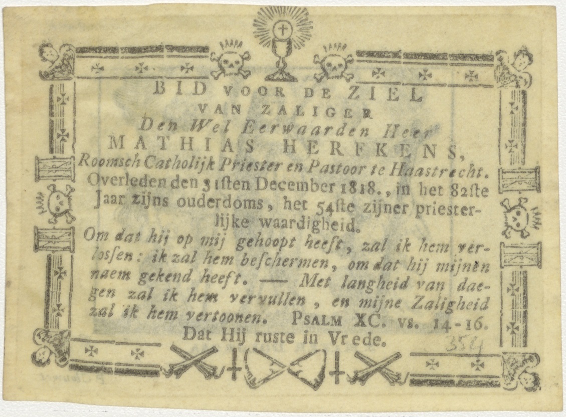 Moeder van Smarten met twee engelen en martelwerktuigen, kz. Religieus;Bid voor ziel Herfkens (+1818);Haastrecht