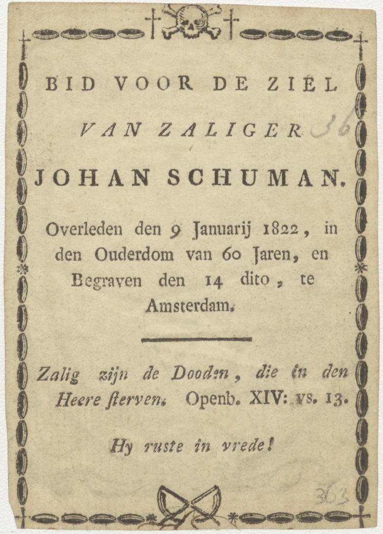 Maria met Christuskind en St. Jan, kz. Bid voor ziel Schuman (+1822);Amsterdam