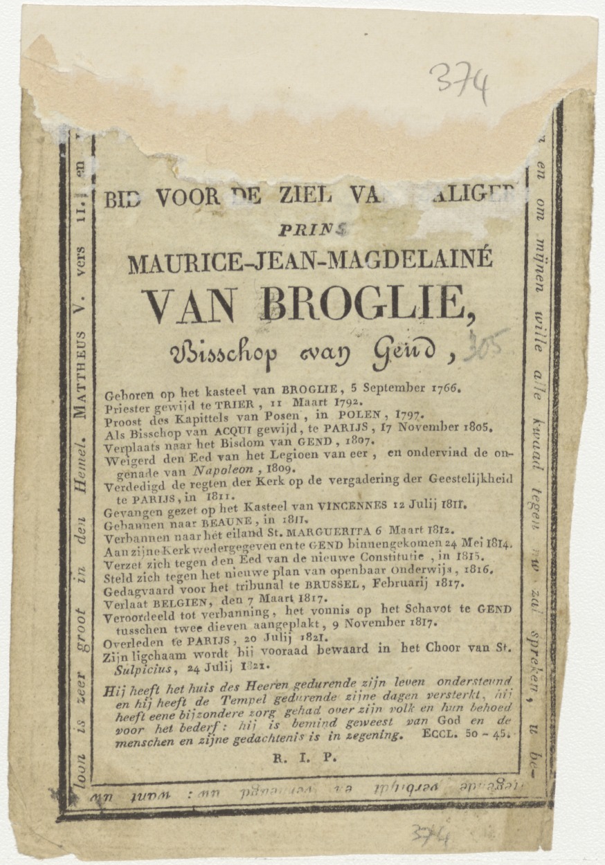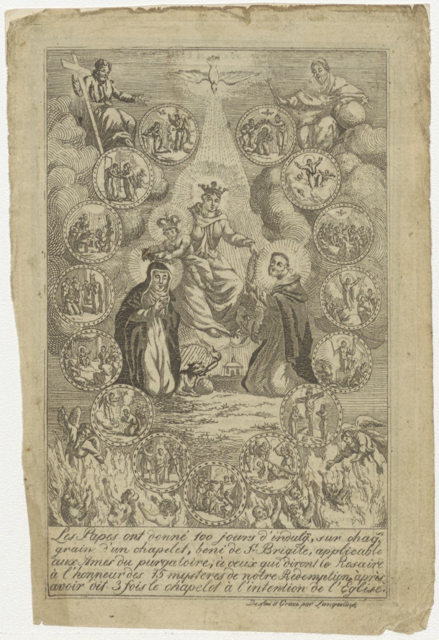 Maria met Christuskind, H. Brigitta en een dominicaner heilige, met 15 mysteriën der Rozenkrans, kz. Religieus;Bid voor ziel Prins Maurice Jean Magdelaine van Broglie (+1821);bisschop van Gend