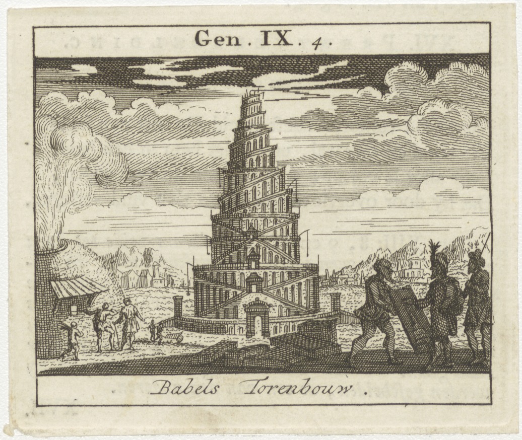 Bijbelscènes (serie): Babels torenbouw (Gen.9:4), kz. boekdruk niet corresponderend met voorzijde;