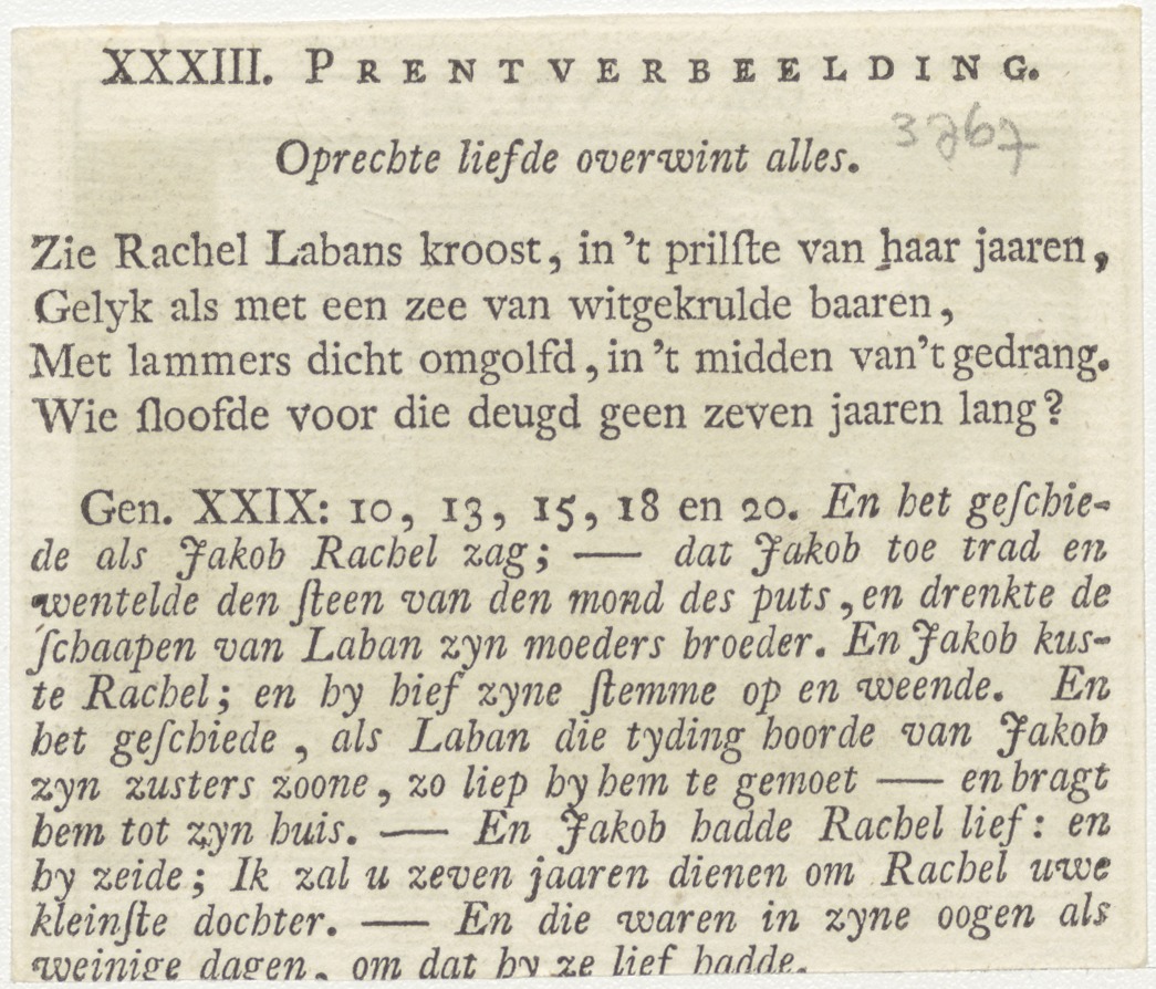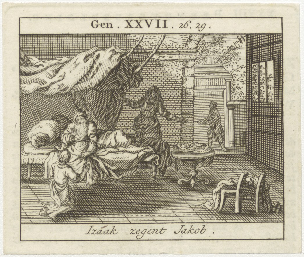 Bijbelscènes (serie): Izaak zegent Jakob (Gen.27:26-29), kz. boekdruk niet corresponderend met voorzijde;