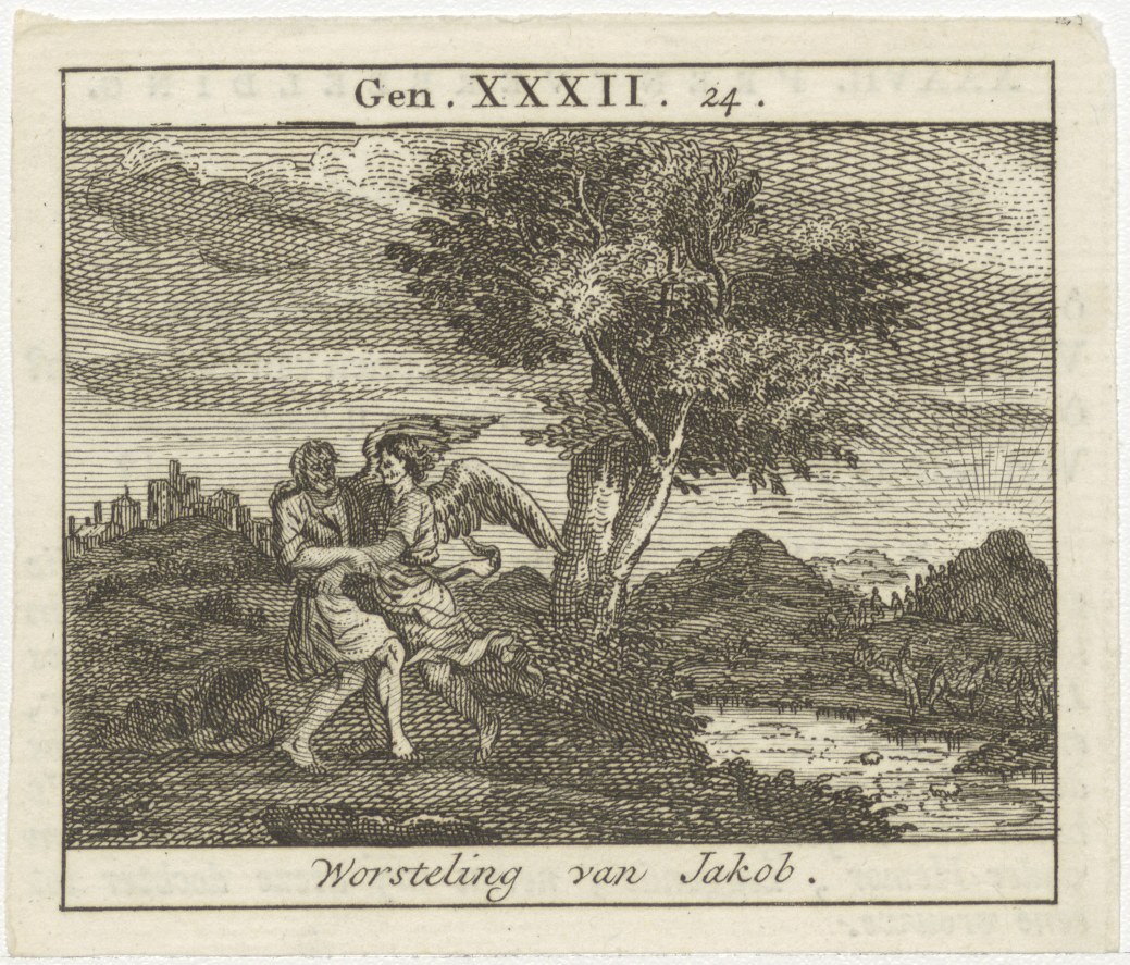 Bijbelscènes (serie): Worsteling van Jakob (Gen.22:24), kz. boekdruk niet corresponderend met voorzijde;