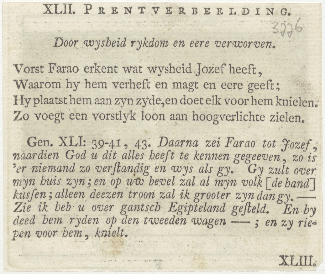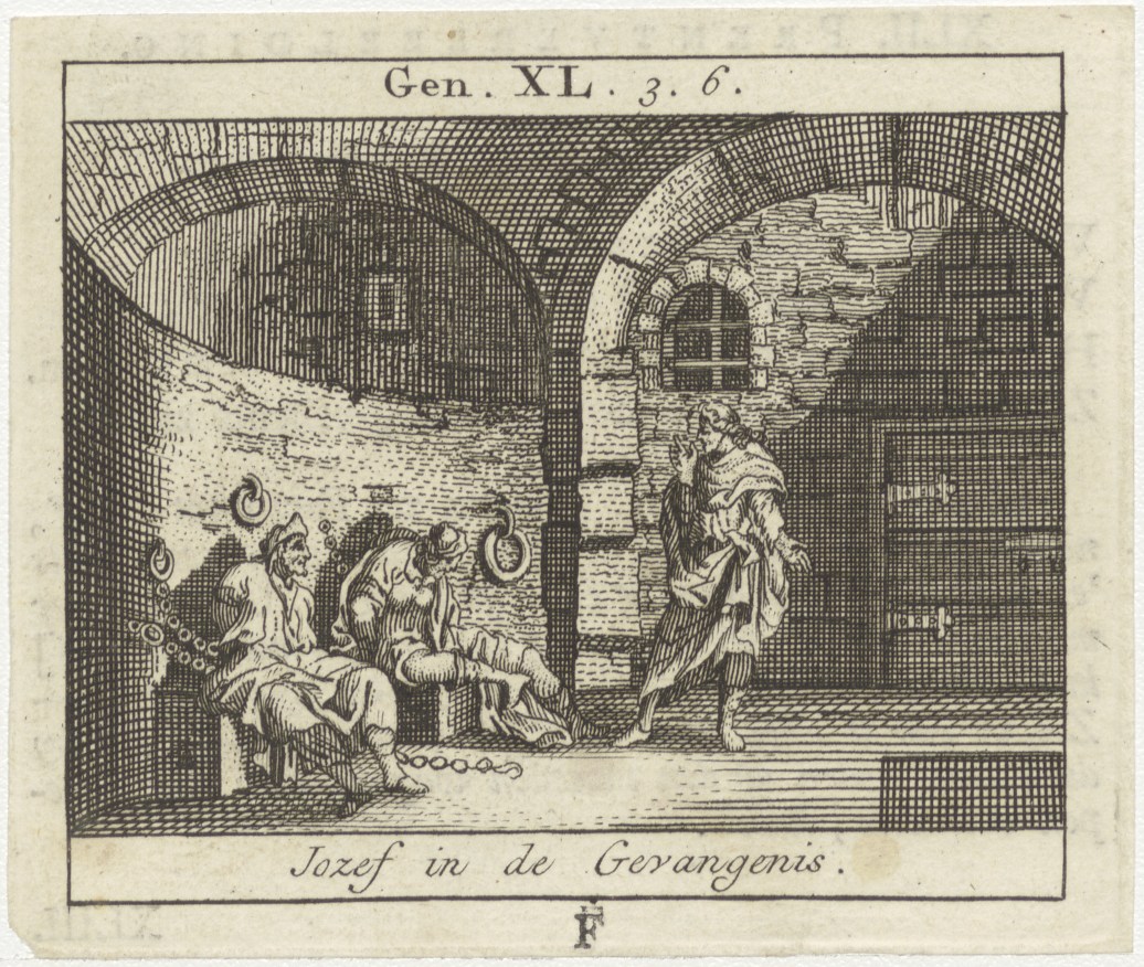 Bijbelscènes (serie): Jozef in de gevangenis (Gen.40:3-6), kz. boekdruk niet corresponderend met voorzijde;