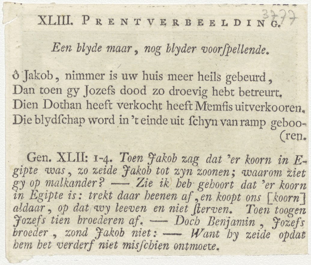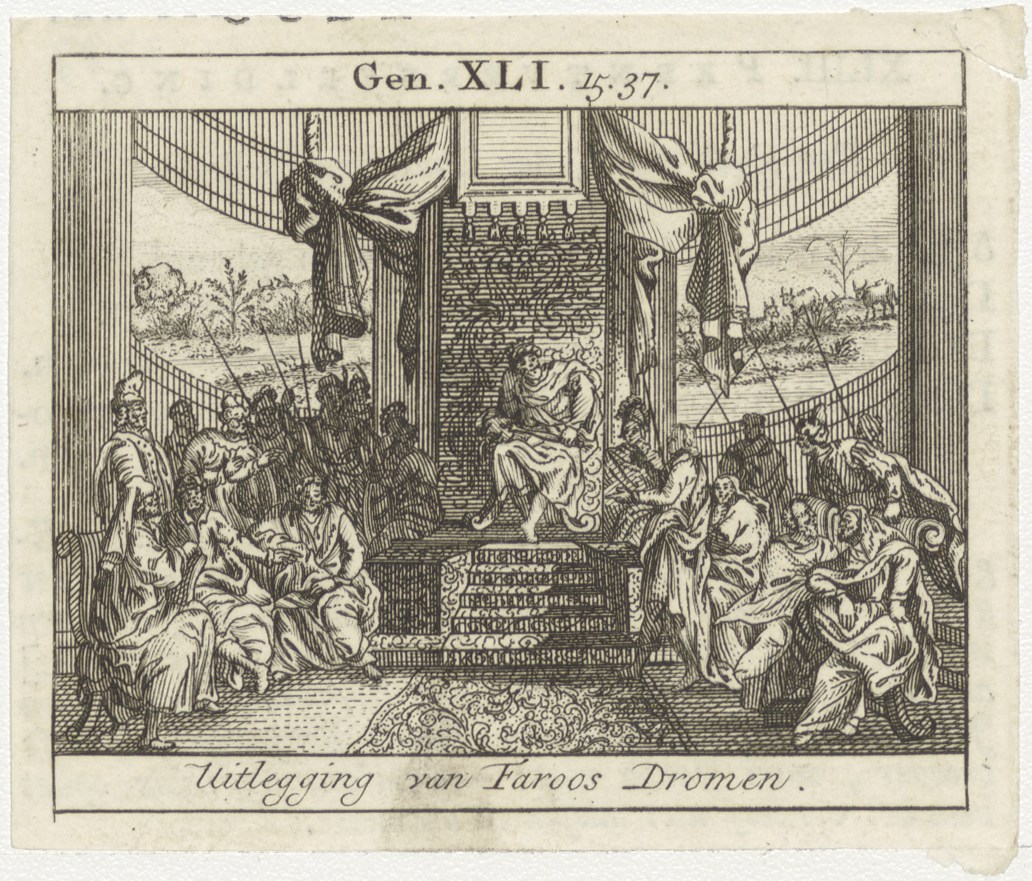 Bijbelscènes (serie): UItlegging van Faraoos droment (Gen.41:15-37), kz. boekdruk niet corresponderend met voorzijde;