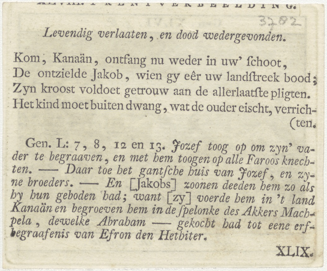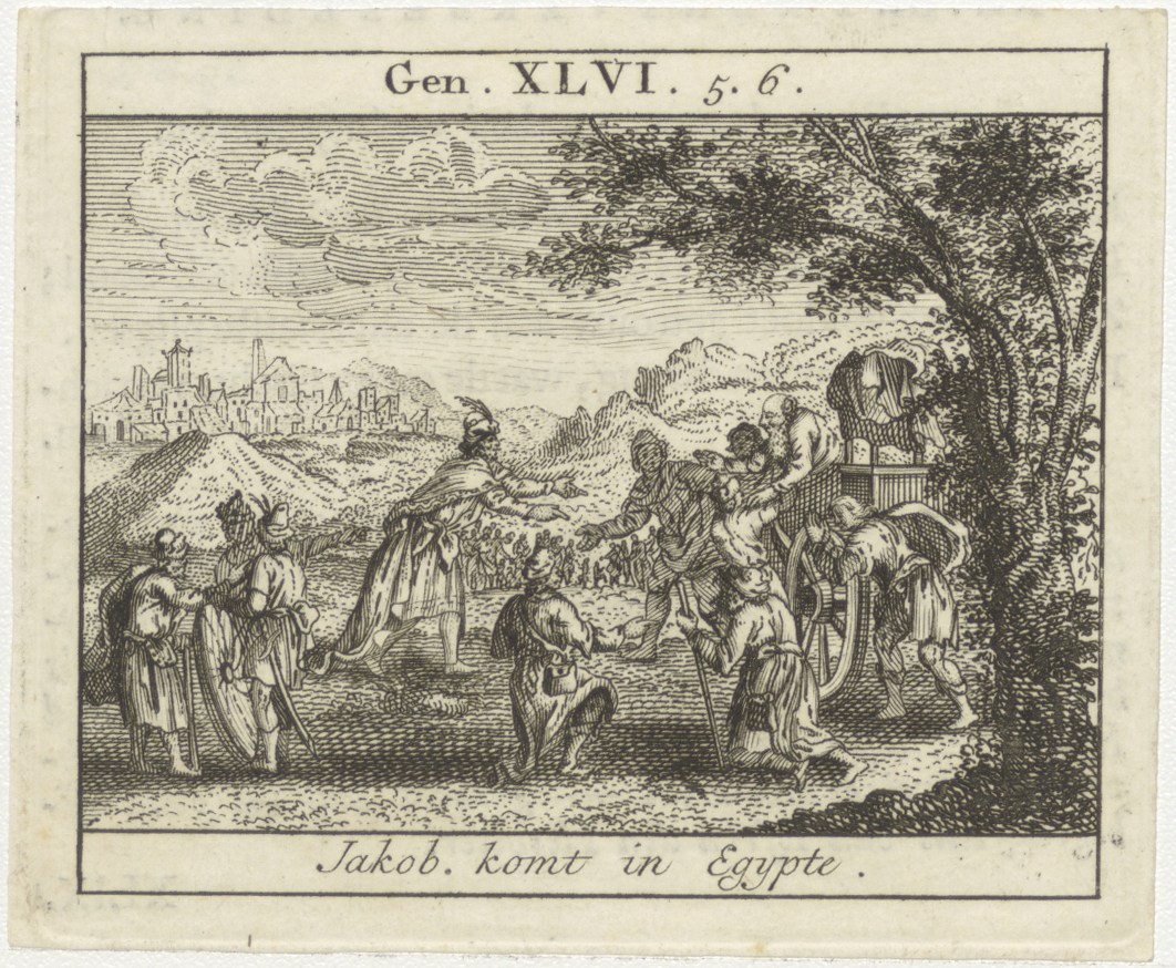 Bijbelscènes (serie): Jakob komt in Egypte (Gen.46:5-6), kz. boekdruk niet corresponderend met voorzijde;