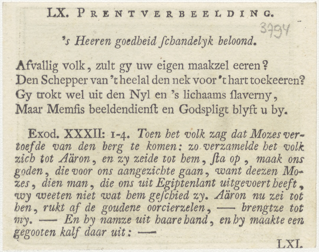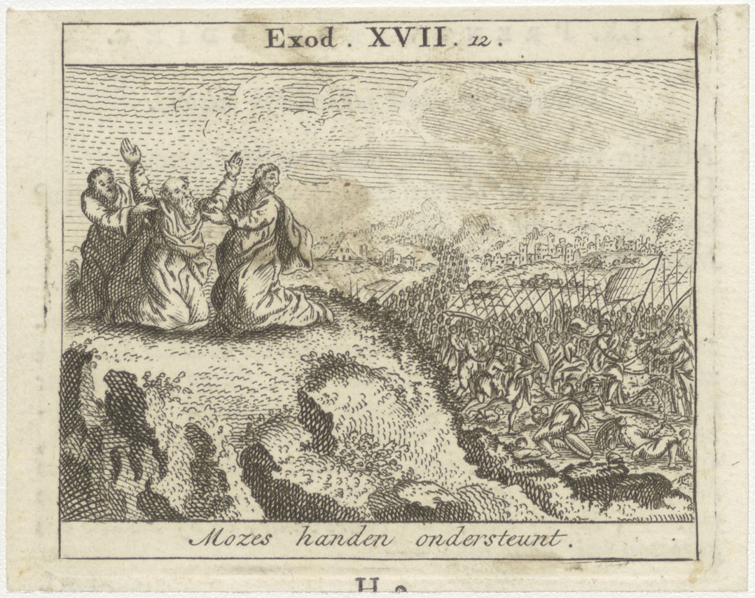 Bijbelscènes (serie): Mozes handen ondersteunt (Ex.17:12), kz. boekdruk niet corresponderend met voorzijde;