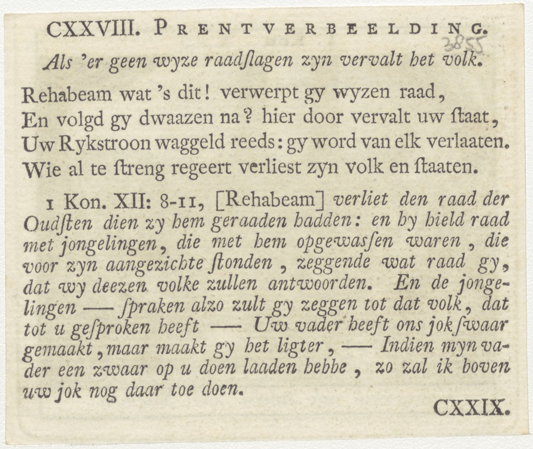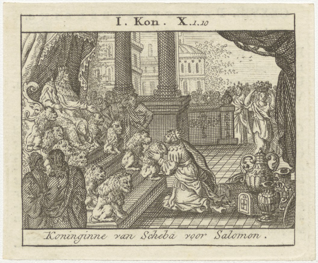 Bijbelscènes (serie): Koninginne van Scheba voor Salomon (1 Kon.10:1-10), kz. boekdruk niet corresponderend met voorzijde;
