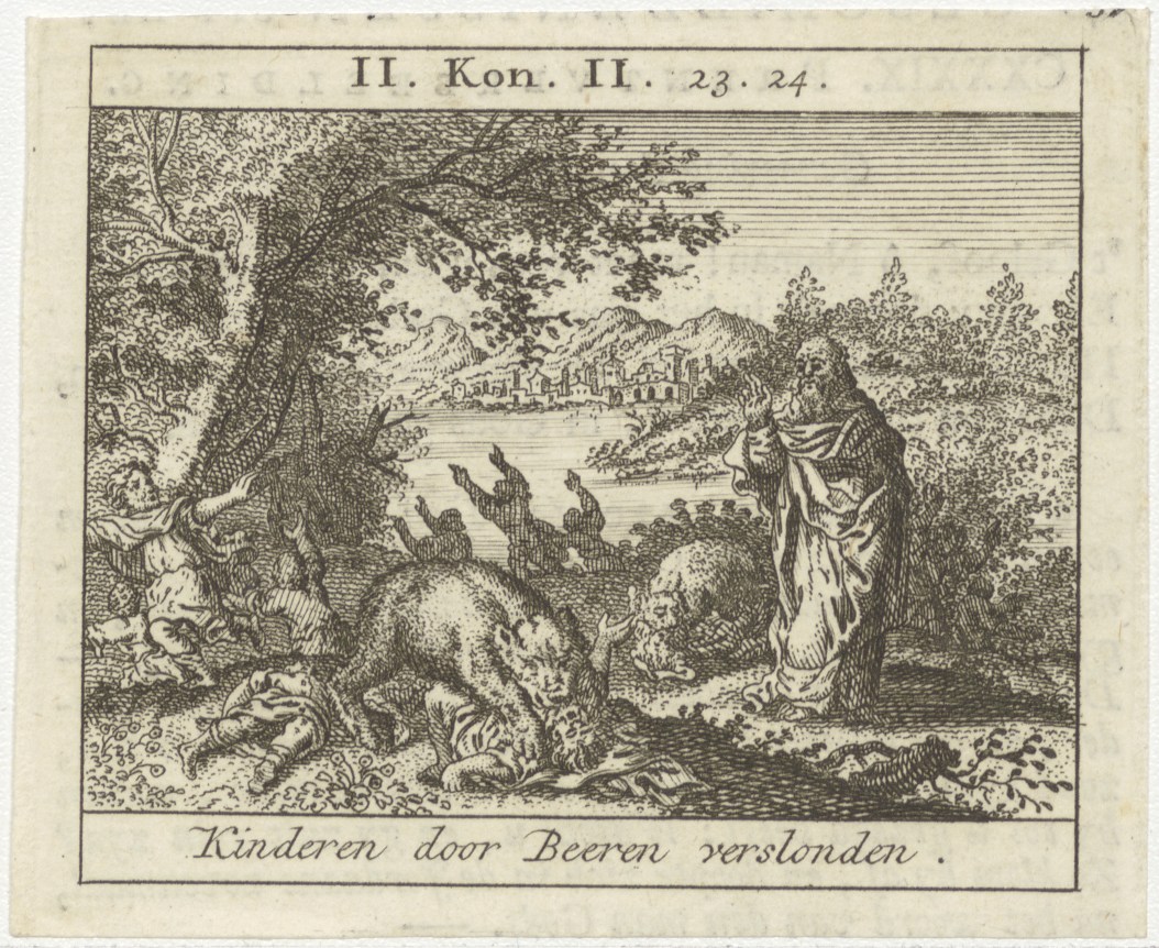 Bijbelscènes (serie): Kinderen door beereb verslonden (2 Kon.2:23-24), kz. boekdruk niet corresponderend met voorzijde;